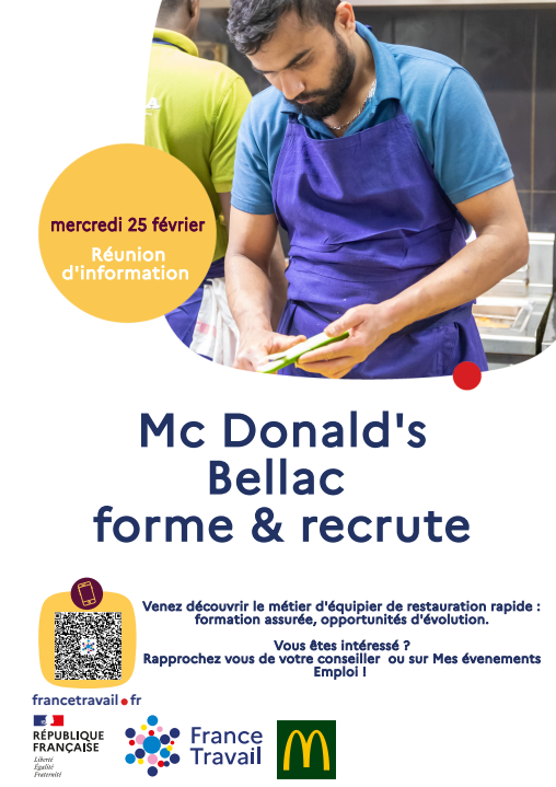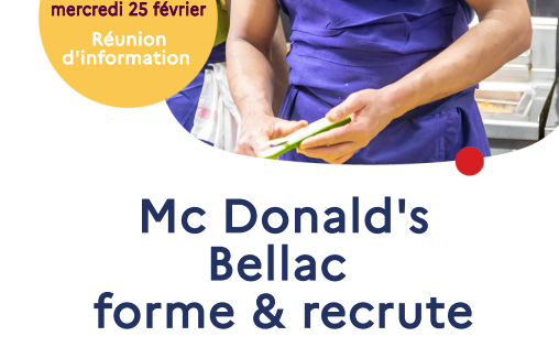 Réunion d’information obligatoire pour intégrer le processus de recrutement McDonald’s, aura lieu le mercredi 25 février au sein de la salle des rochettes à Bellac.